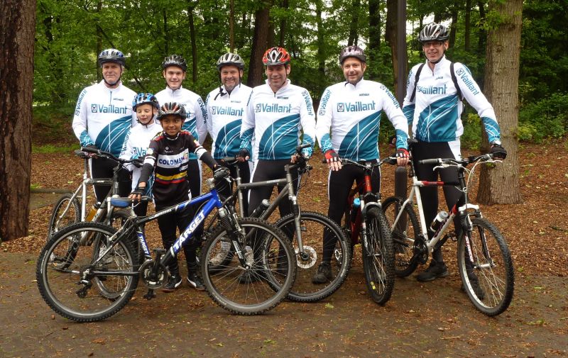 Een groep enthousiaste moutainbikers uit Tollebeek is blij verrast met de professionele wielerkleding van Vaillant.